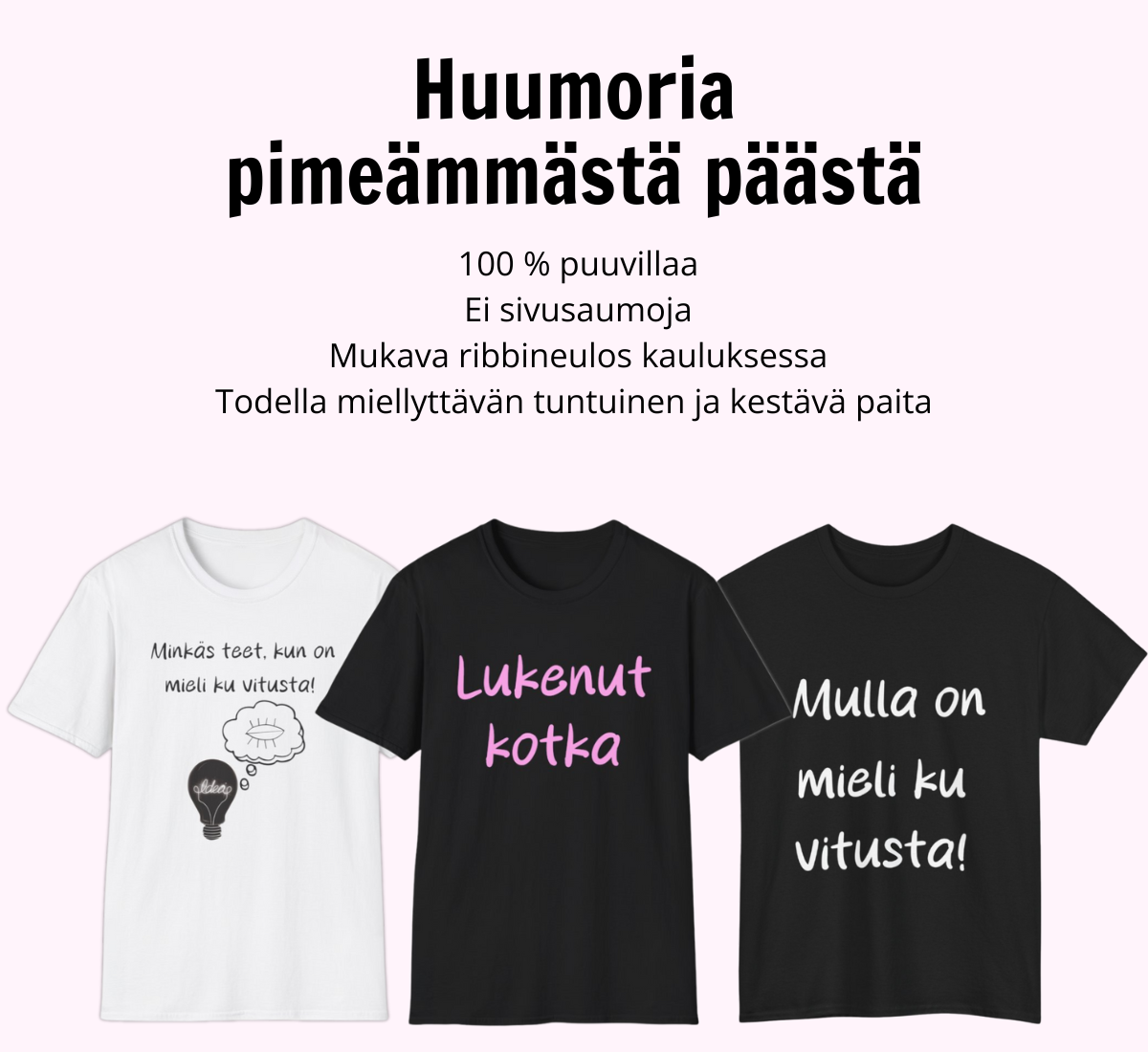 Unohda tylsät peruspaidat – nämä t-paidat kantavat mukanaan sananmuunnoksia, huumoria ja oivalluksia. Ne sopivat yhtä hyvin lahjaksi kuin omaan arkeen, kun haluat pukea päälle jotain, mikä saa muutkin hymyilemään.