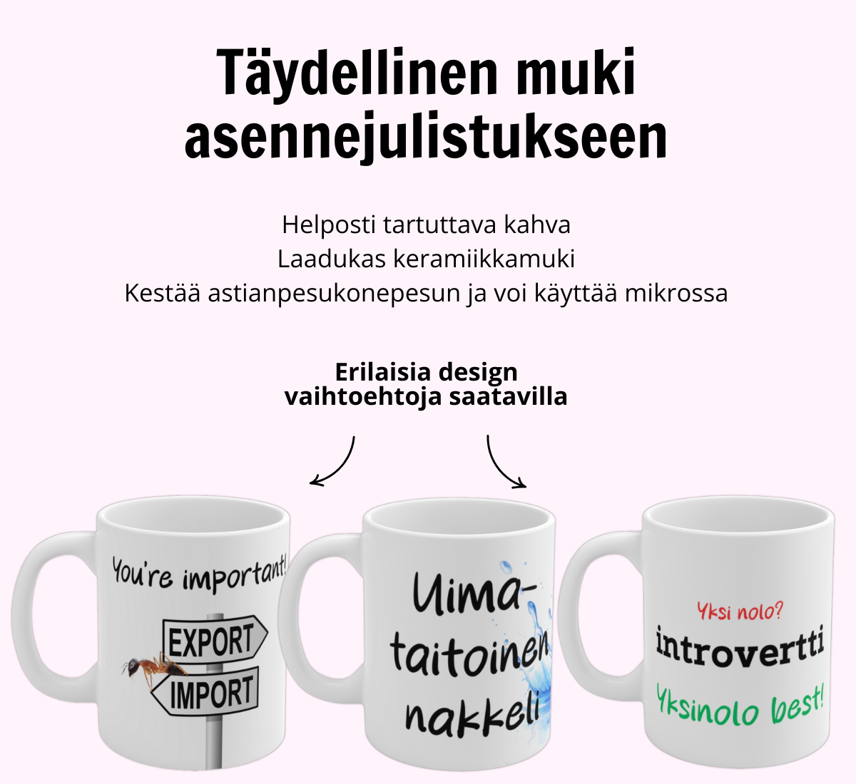 Meidän mukit eivät ole vain kuppeja kahville tai teelle – ne ovat pieniä asennejulistuksia. Olit sitten introvertti, kielipoliisi, huumoriveikko tai vain aamukahvia tarvitseva sielu, näistä mukeista löytyy juuri se, joka naurattaa sinua (ja todennäköisesti vähän muitakin). Kaikki mukimme kestävät arjen kuumat juomat, mutta eivät välttämättä kestä liian vakavia keskusteluja – onneksi huumori tekee niistä vieläkin parempia!